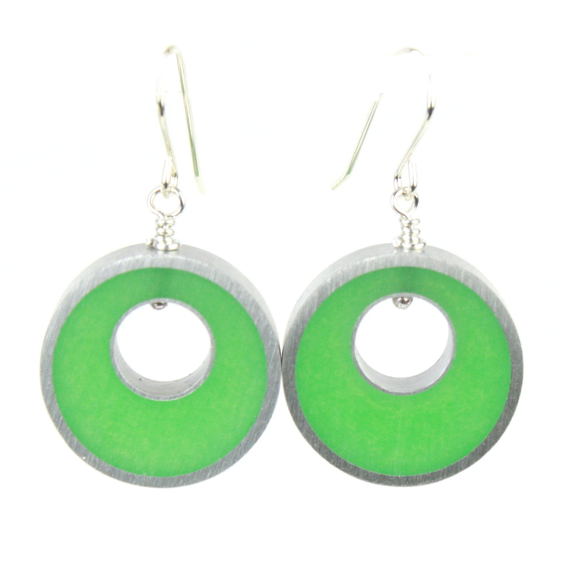 Brighten your look with the vibrant green Spotlight Earrings. Handcrafted from eco-resin and salvaged aluminum, these lightweight earrings are complemented by sterling silver ear wires, combining sustainability with striking style.